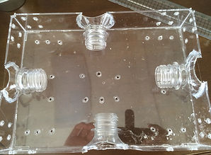 プラスチック製のびんどうを参考して作成した「びんどう型捕獲器」です。書類などを入れるプラケースを改造して作りました。